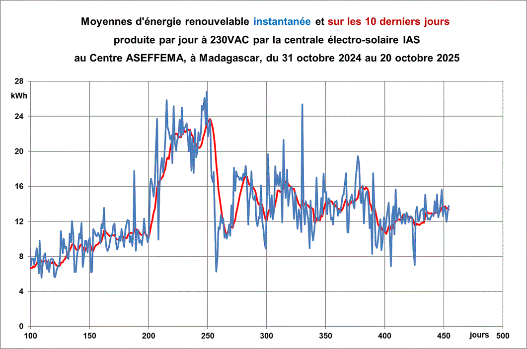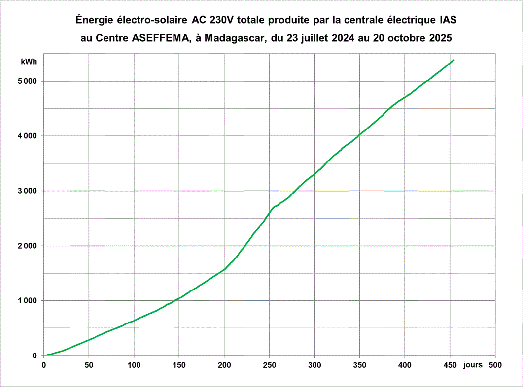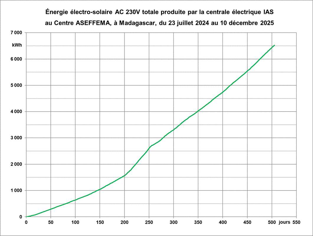 Entre l’atelier des couturières (6) et le poulailler (7), on a fait construire un local technique pour abriter la centrale solaire (batteries, onduleurs, commandes et protections). Les panneaux solaires se répartissant sur les 3 toits.