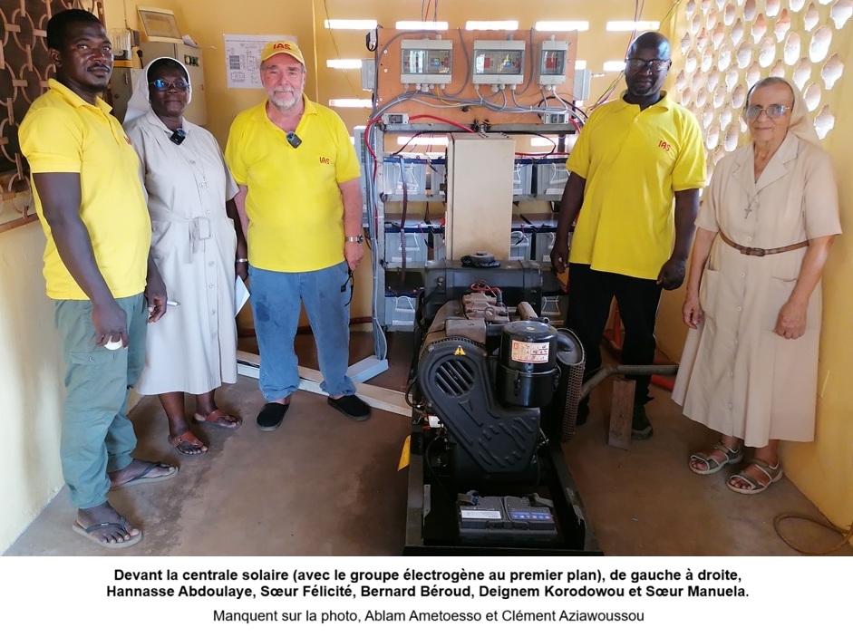 Avant l’intervention d’IAS, le Centre des Sœurs était alimenté en triphasé par la CEET (le réseau public togolais). Les fréquents et parfois longs délestages de la tension (également peu stable) fournie par la CEET étaient compensés par un gros groupe électrogène qui devait être enclenché à la main. L’électricité manquait le temps qu’un(e) préposé(e) intervienne. Et les factures du carburant s’additionnant à celle de la CEET représentaient une charge financière importante.