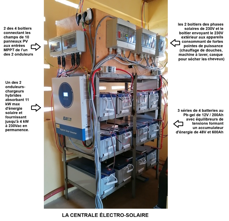 2 onduleurs hybrides pouvant délivrer 4 kW en permanence (8 kW en pointe), qui comprennent chacun 2 régulateurs MPPT de charge solaire, alimentent le site à 230V alternatifs.