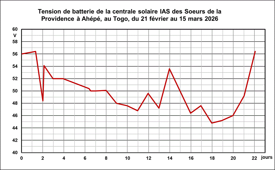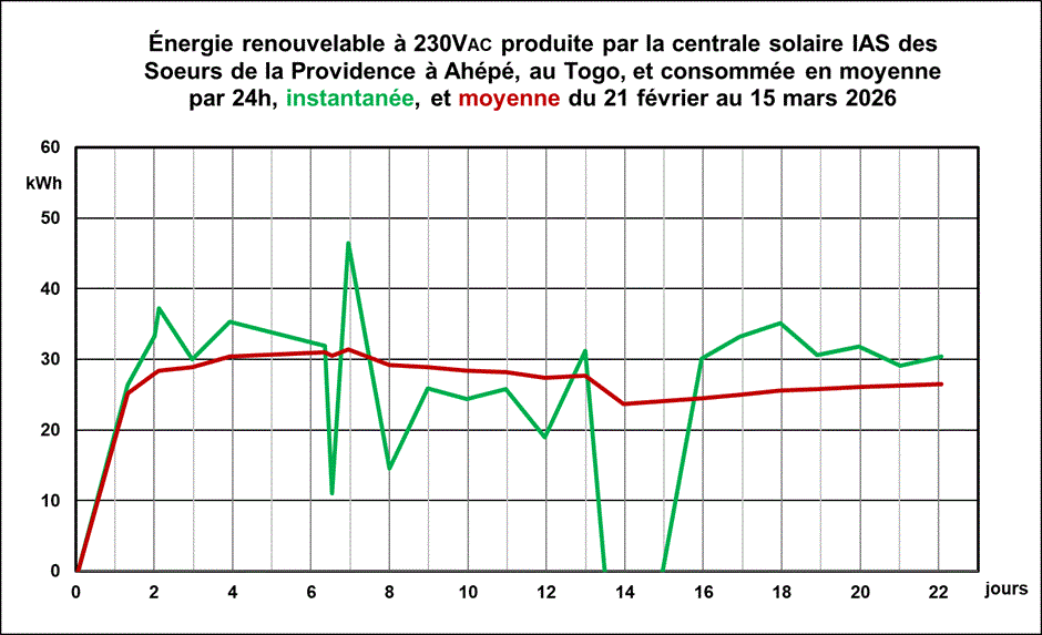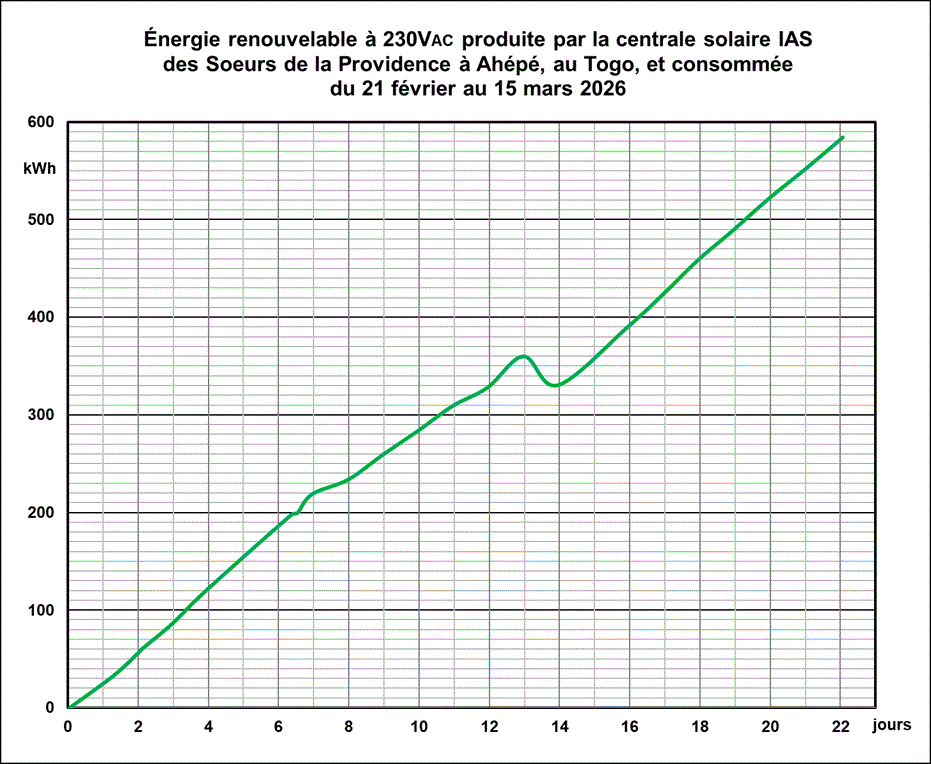 Avant l’intervention d’IAS, le Centre des Sœurs était alimenté en triphasé par la CEET (le réseau public togolais). Les fréquents et parfois longs délestages de la tension (également peu stable) fournie par la CEET étaient compensés par un gros groupe électrogène qui devait être enclenché à la main. L’électricité manquait le temps qu’un(e) préposé(e) intervienne. Et les factures du carburant s’additionnant à celle de la CEET représentaient une charge financière importante.