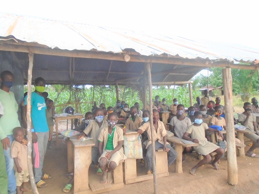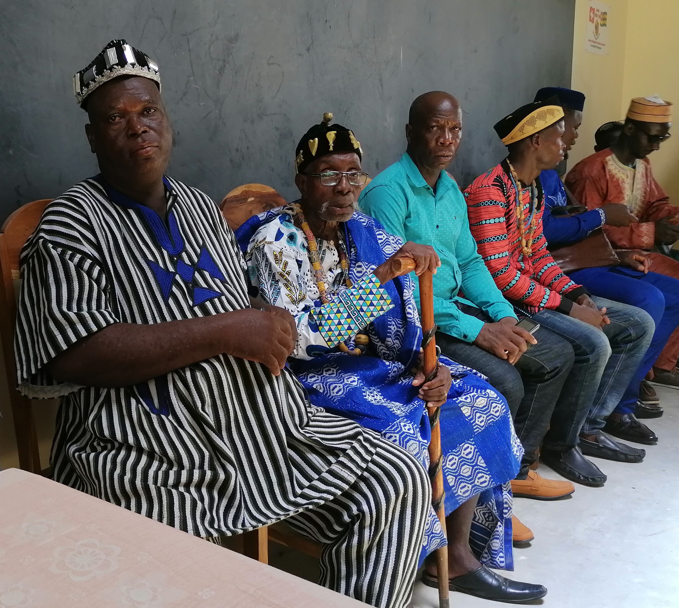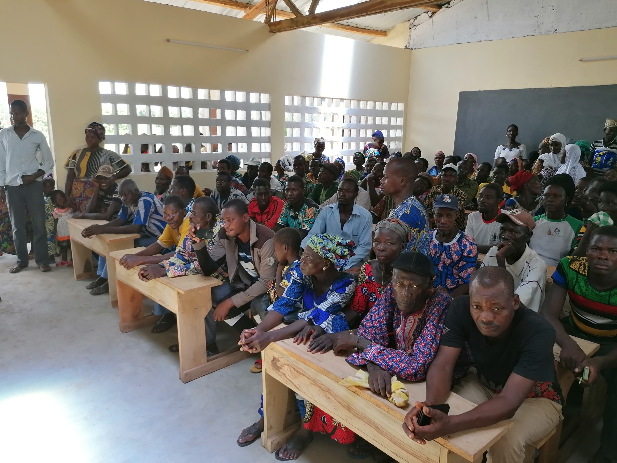dans une classe, les autorités politiques et traditionnelles face à la population (ceux qui ont trouvé place…)