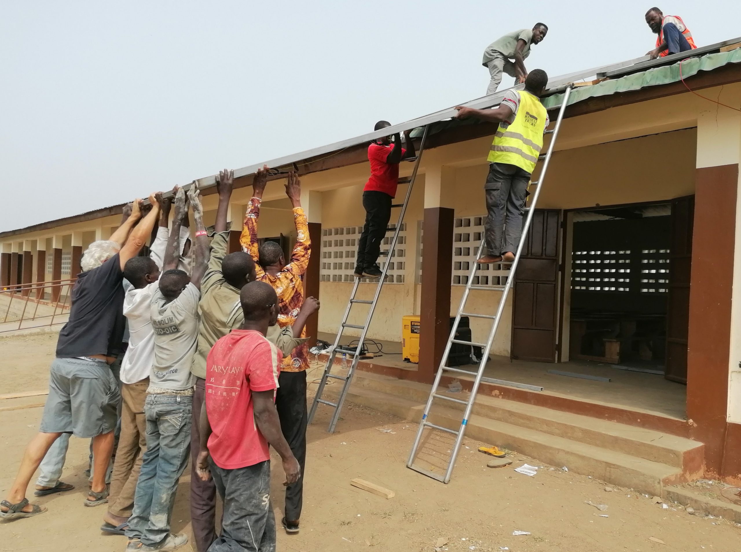 Toutes les mains sont utiles pour monter les lourds cadres sécurisés des panneaux solaires sur le toit de l’école.